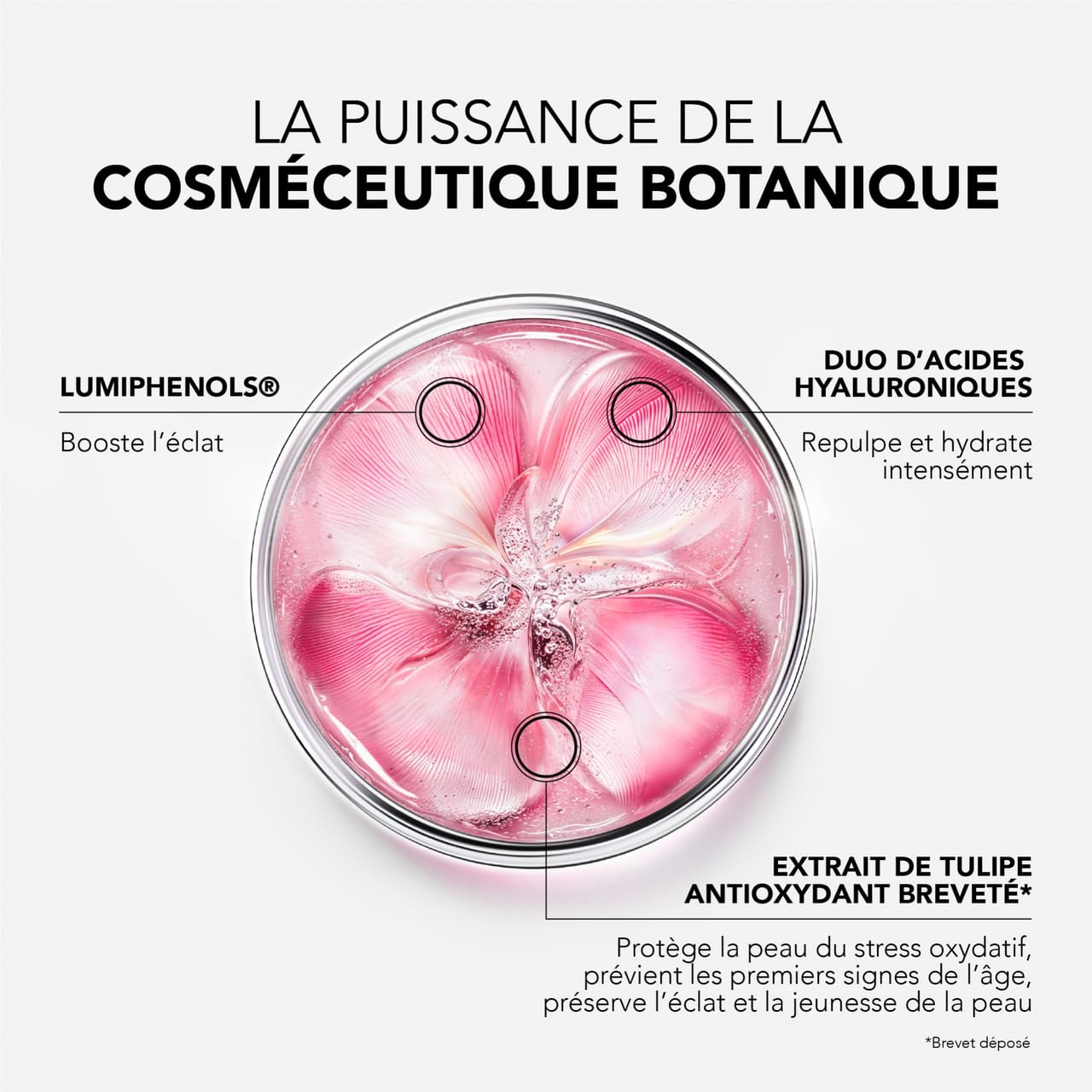 Au cœur de la formule, les Lumiphénols® boosters d’éclat corrigent les taches pour un teint plus uniforme. Le duo d’acides hyaluroniques de haut et bas poids moléculaires hydrate et repulpe, tandis que l’extrait de tulipe antioxydant breveté*, fruit de 12 années de recherche, préserve l’éclat, stimule les défenses naturelles de la peau et prévient les premiers signes de l’âge.