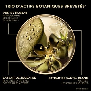 Au cœur de sa formule, un trio d’actifs botaniques précieux – extrait de santal blanc, extrait de joubarbe et ARN de baobab – réactive les protéines messagères de longévité cellulaire** pour corriger tous les signes de l’âge. Associé à l’acide hyaluronique et à la niacinamide, il agit sur 3 causes du vieillissement de la peau. Enrichie en beurre de karité, la formule apporte une nutrition et un confort intenses.